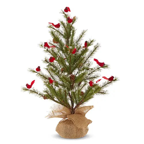 Presenting a charming 24.5-inch decorative tree, elegantly adorned with cardinal birds, all nestled within a rustic burlap bag. The tree showcases a verdant green hue, skillfully crafted from a blend of plastic, iron, pinecones, and authentic feathers, ensuring a refined and natural appearance. This exquisite piece measures 13.25 inches in length, 12 inches in width, and stands at an impressive 24.5 inches in height, making it a captivating centerpiece for any sophisticated setting.