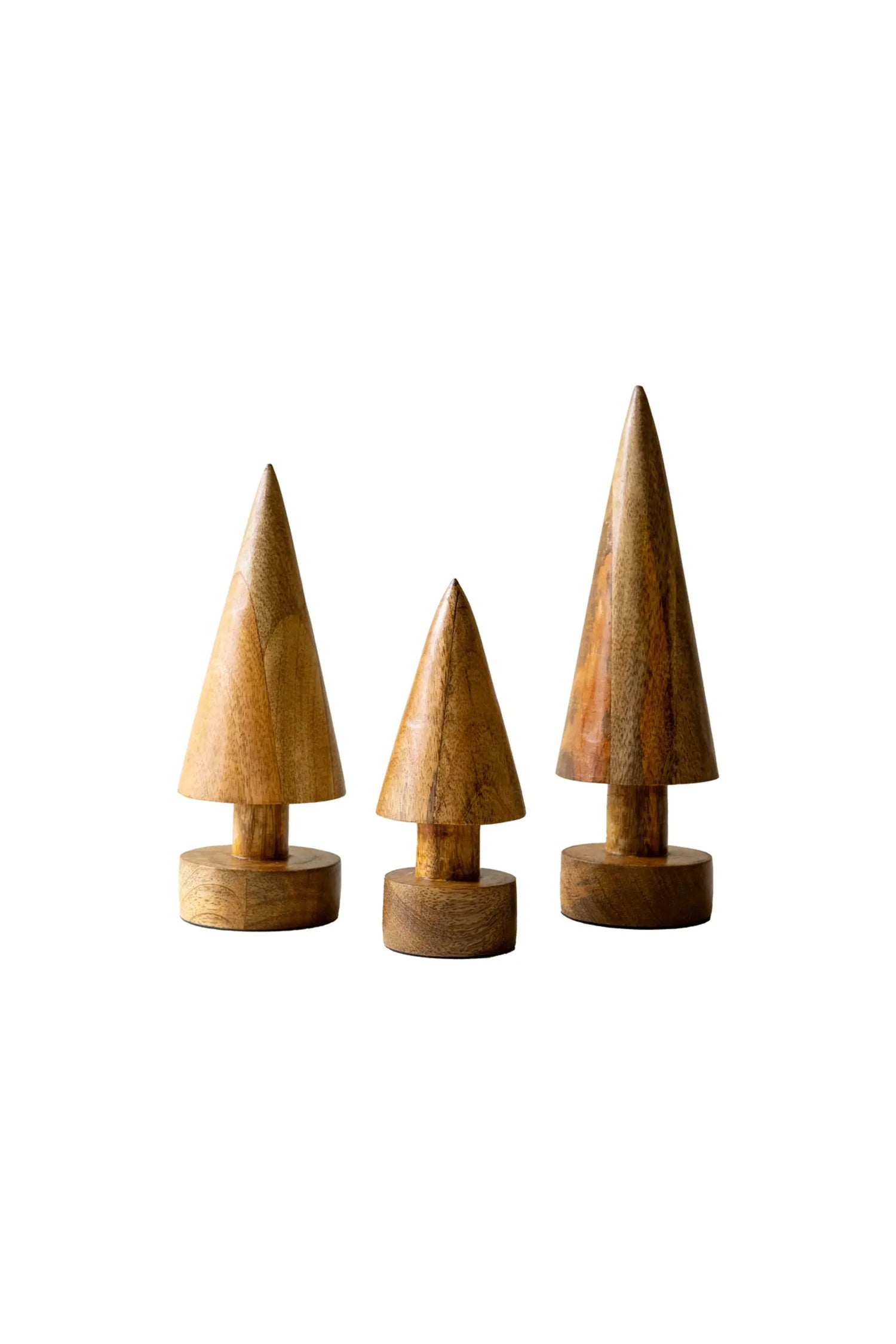 This set contains three wooden Christmas trees for the holidays. Made in India, the three different sizes are 2"X6", 3"X8", and 3"X 9.5". These trees stand on wooden pedestals and are suitable for any decor. Group them for an interesting display or separate the set.